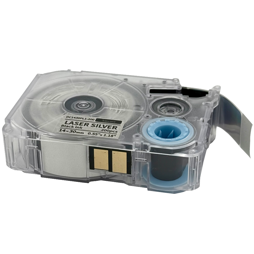 Laser-sølvfarvet labeltape der er 14 mm bredt og 30 mm langt. Der er 200 labels i én kassette.